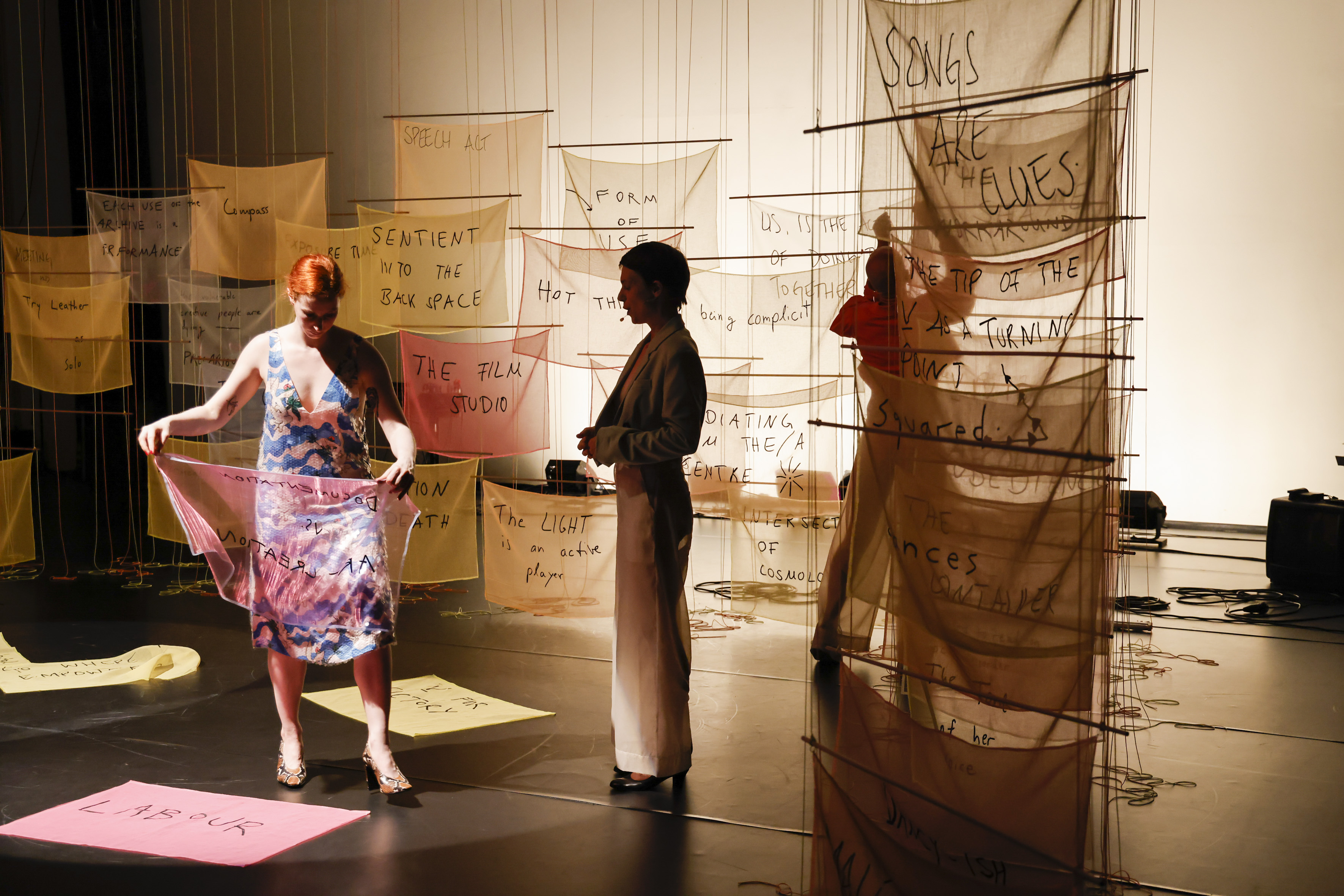 Britta talking about the recipe card "Documentation vs. Art Creation" with Kasia arranging banners and William rehanging banners, Tanzfabrik Berlin, June 2021 – photo by Anja Weber